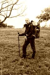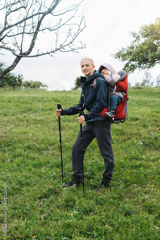Sleepy tired child walking with father in backpack in the mountains. Nordic walk with family and kid in fall. obstacles and challenges for man traveling outdoors. Adventure hiking tour