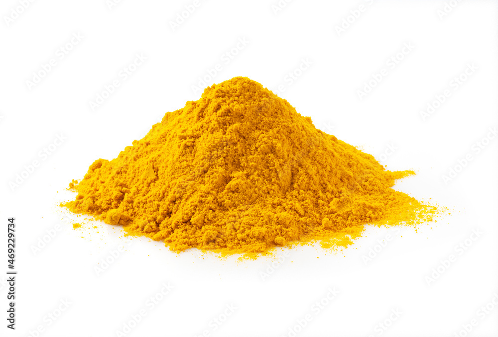 Dry turmeric powder on a white background; Curcuma domestica powder