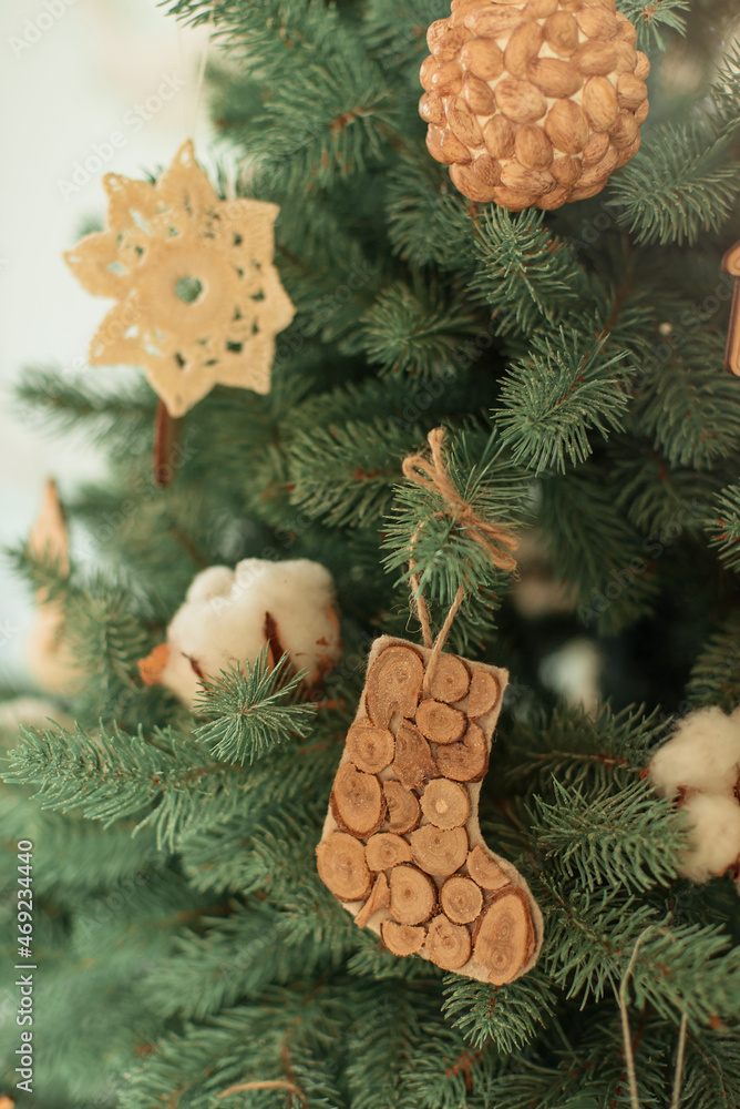 Christmas and zero waste, eco friendly packaging gifts in kraft paper on a wooden table, eco christmas holiday concept, natural decor in winter