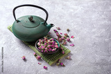 Beautiful green japanese cast iron teapot with tea of dry roses