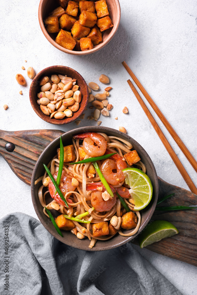 Traditional dish of asian cuisine is pad thai. Udon noodles with shrimps and fried tofu