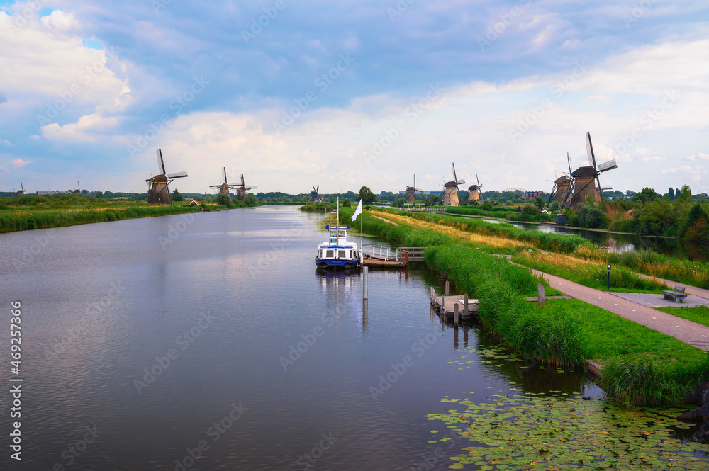 Historic windmills and a river with a boat in Kinderdijk, Netherlands