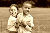 childhood, leisure and people concept - happy smiling little boy and girl hugging at park
