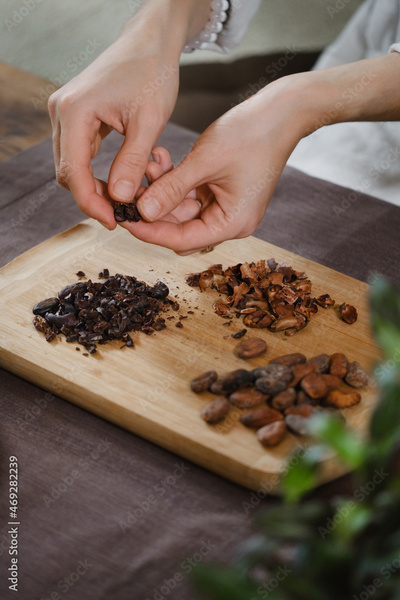 Hands peeling organic cacao beans on wooden table, cocoa nibs, artisanal chocolate making in rustic style for ceremony on the table. Degustation, close-up