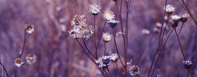 Delicate orange purple sunset. Autumn evening. Dry plants and white flowers. Close-up. Floral vintage background.