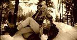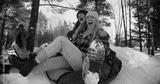 Two attractive multiethnic happy women smile sledging on snow slope towards camera, winter weekend fun slow motion.