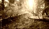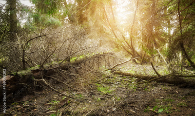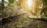 Picture of an old deep forest against the sun.