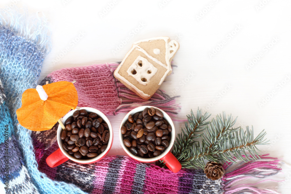 cups with roasted coffee beans, knitted scarves, spruce branch, gingerbread house top view. cozy warming homemade drink