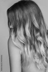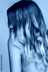 Close-up of the wavy blonde hair of a young blonde woman isolated on a gray background. Result of coloring, highlighting, perming. Beauty and fashion. Vertical shot