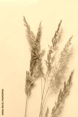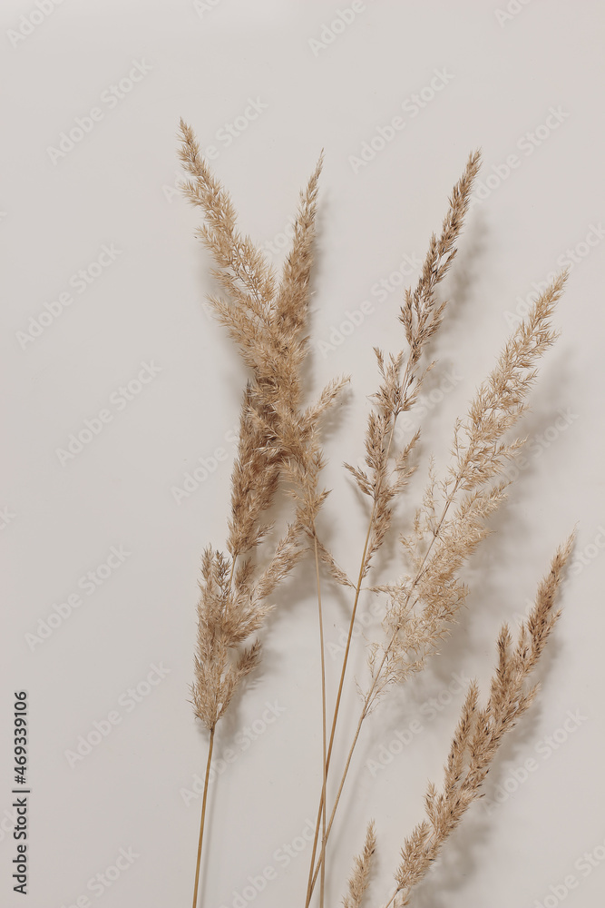Close-up of beautiful dry grass bouquet. Festuca plant. Botanical texture. Beige wall background. Floral home decoration. Natural detail. Feminine still life. Autumn, fall composition. Vertical.