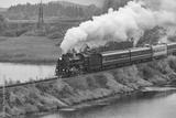 Retro steam train moves along the lake at autumn cloudy time. Karelia. Russia.