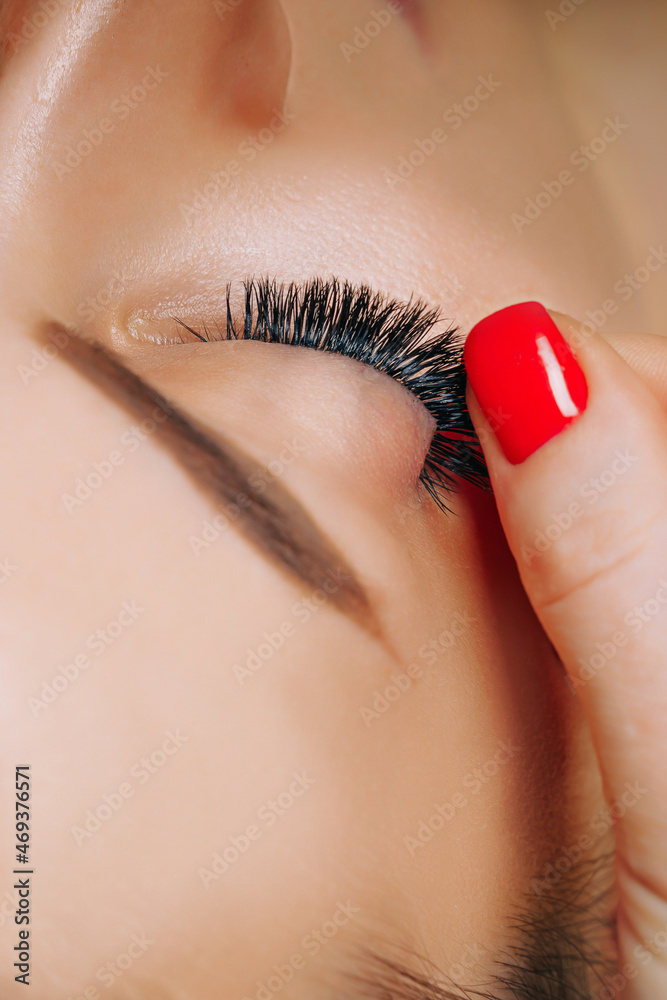 Eyelash Extension Procedure. Woman Eye with Long Eyelashes. Close up, selective focus.