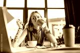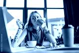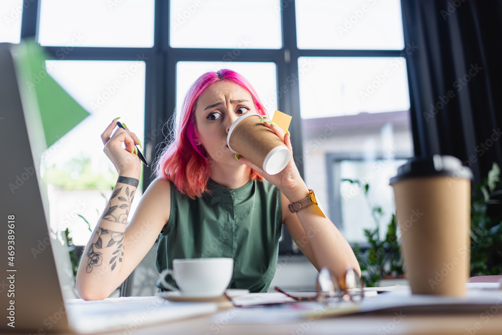 shocked businesswoman with pink hair drinking coffee near laptop in office.