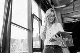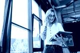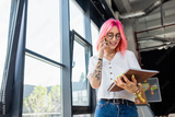happy and pierced manager with pink hair talking on cellphone and looking at folder.