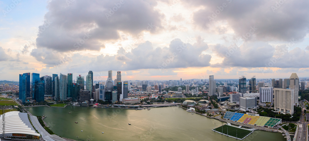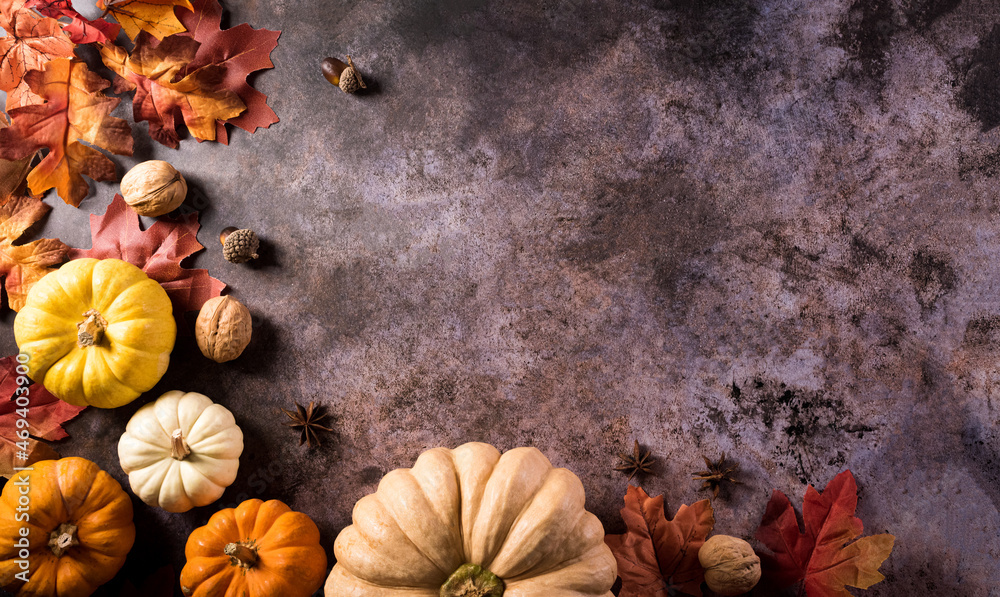 Thanksgiving background concept with fall leaves, pumpkin and seasonal autumnal decor on dark stone background, top view, copy space.