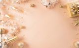Happy New year celebration background concept. Golden gift box, stars, christmas ball and champagne on pastel background.