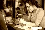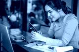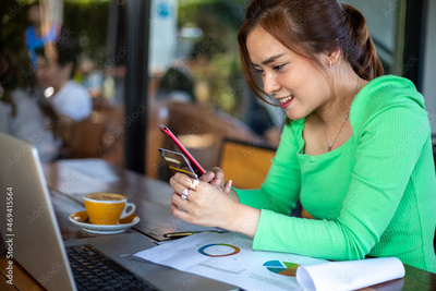 Asian women drinking coffee in a cafe and shopping online and paying with credit card on smart phones
