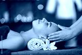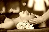 Relaxed young African-American woman getting facial massage by therapist in spa salon