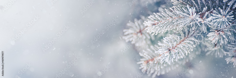 Fir-tree Branch Covered with Frost. Christmas Card with Winter Background.