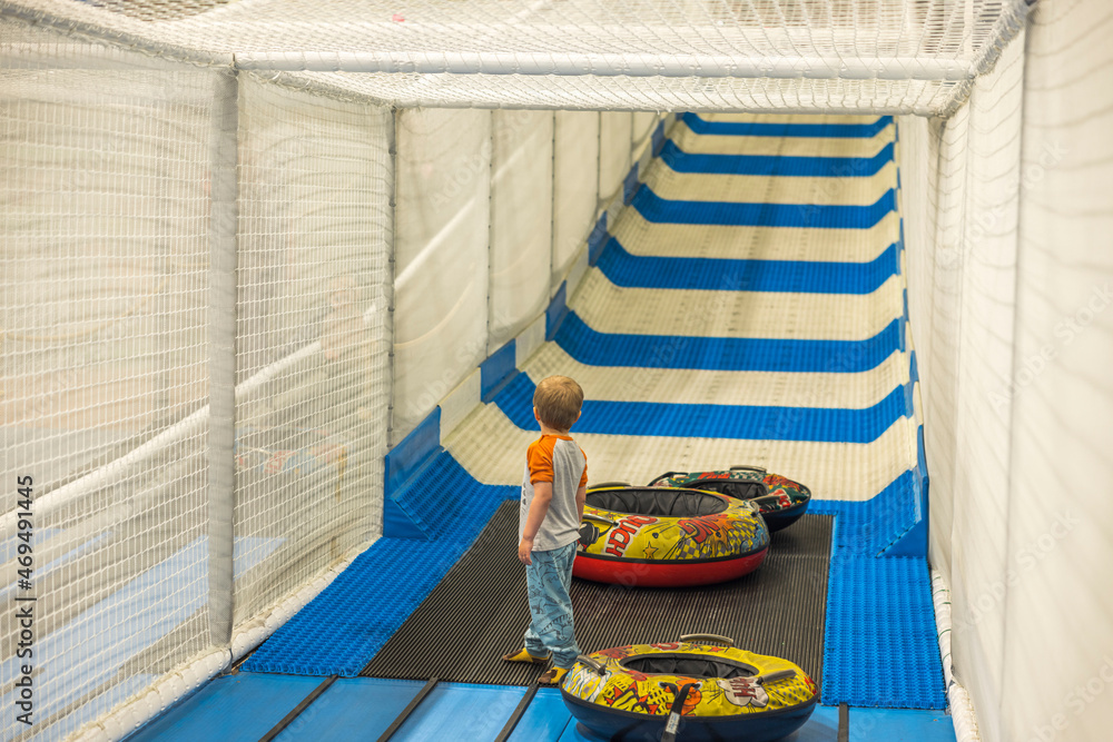 Children on indoor slide at play center. Sweden.