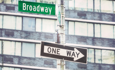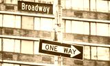One Way traffic sign at Broadway road, color toning applied, selective focus, New York City, USA.