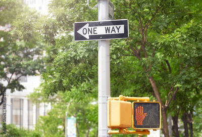 One Way traffic sign and pedestrian signal, selective focus, New York City, USA.