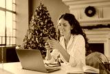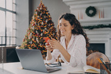 Joyful europian woman sitting at desk with laptop, reading xmas news or message on smartphone