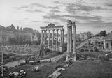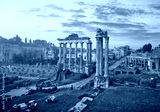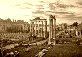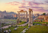 Roman Forum in Rome, Italy. Antique structures with columns. Wrecks of ancient italian roman town. Sunrise above famous architectural landmark.