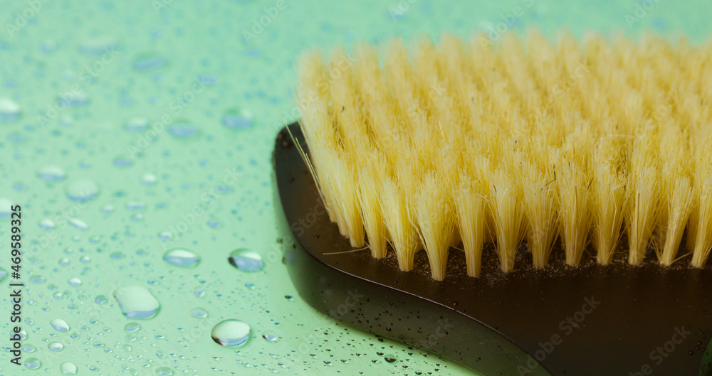 A brush for dry massage with cactus fibers stiff pile. Water drops on green. Spa