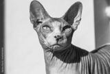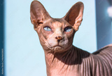 Gray blue-eyed bald Canadian Sphynx cat white muzzle portrait. Sphinx feline.