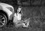 A woman, student girl is sitting on a grass in a wood, remote working at laptop.