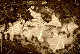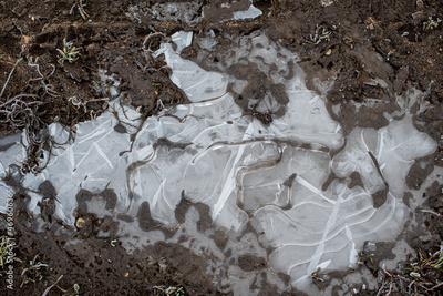 Frozen puddle and frosted mud and grass on a cold autumn morning