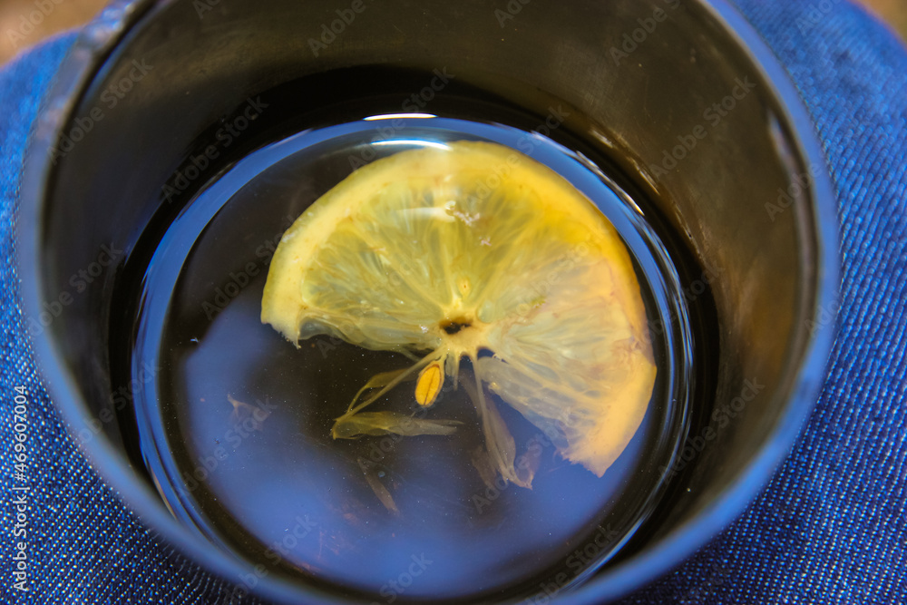 Black tea with a slice of lemon in a cup top view, hot drink in a thermos cup.