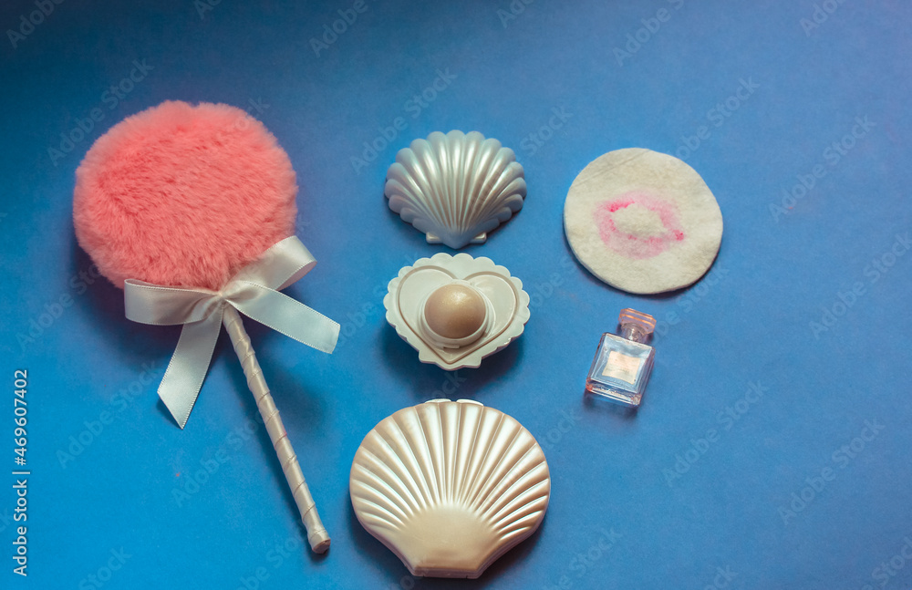 Powder puff, mirror, lip balm, lip print on blue. Makeup accessories composition