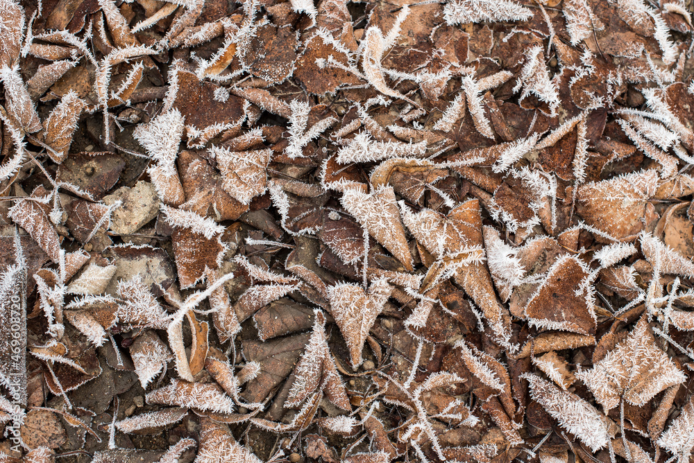 Background with frosty brown dead tree leaves on a cold autumn morning