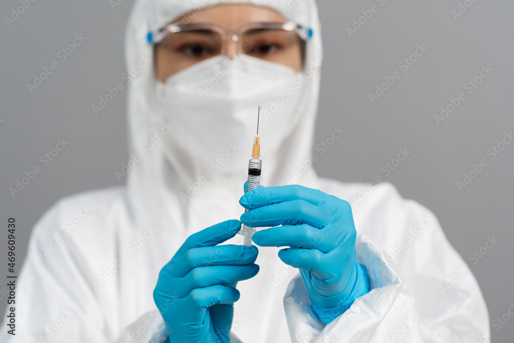 doctor in PPE suit holding syringe with Coronavirus (Covid-19) vaccine for injection test