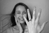 Excited girl against purple wall bragging pointing an engagement ring on finger.