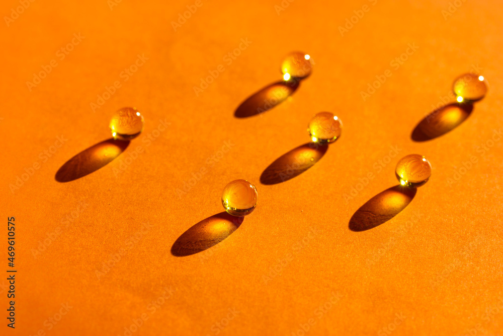 Yellow fish oil pills, vitamins aevit, omega 3 gelatin capsules, tablets lie on orange table leaving contrasting shadows. Medical, health care, medicine treatment minimalistic monochrome background.