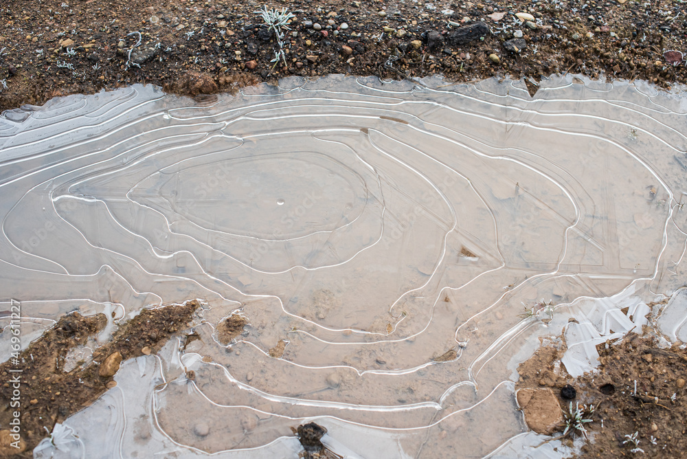 Frozen puddle with rings, frosted mud and grass on a cold autumn morning