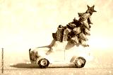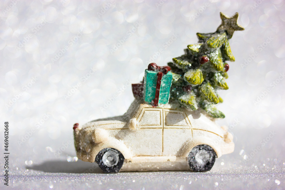 White toy car with Christmas tree on roof on a silvered background New Year 2022