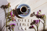 Cup on a white table. Coffee time text, smiley, heart, home. Dried lilac flowers