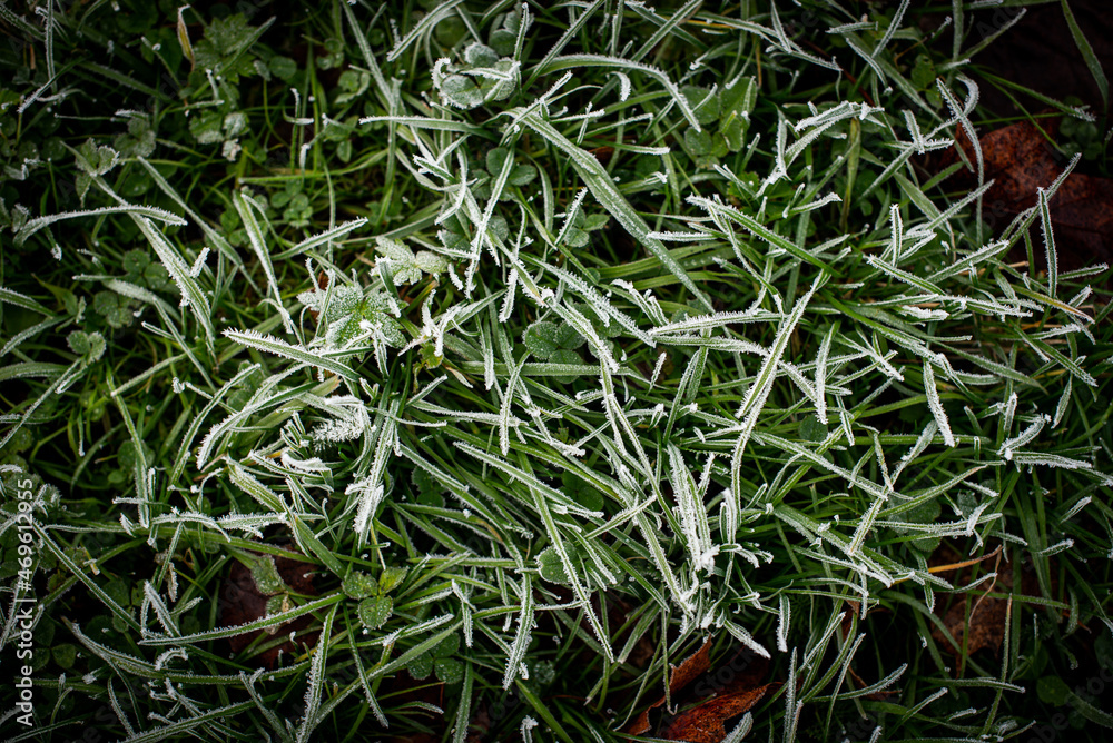 Background with frosty plants and dead leaves on a cold autumn morning