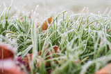 Frosty green fresh grass and brown dead leaves on a cold autumn morning