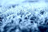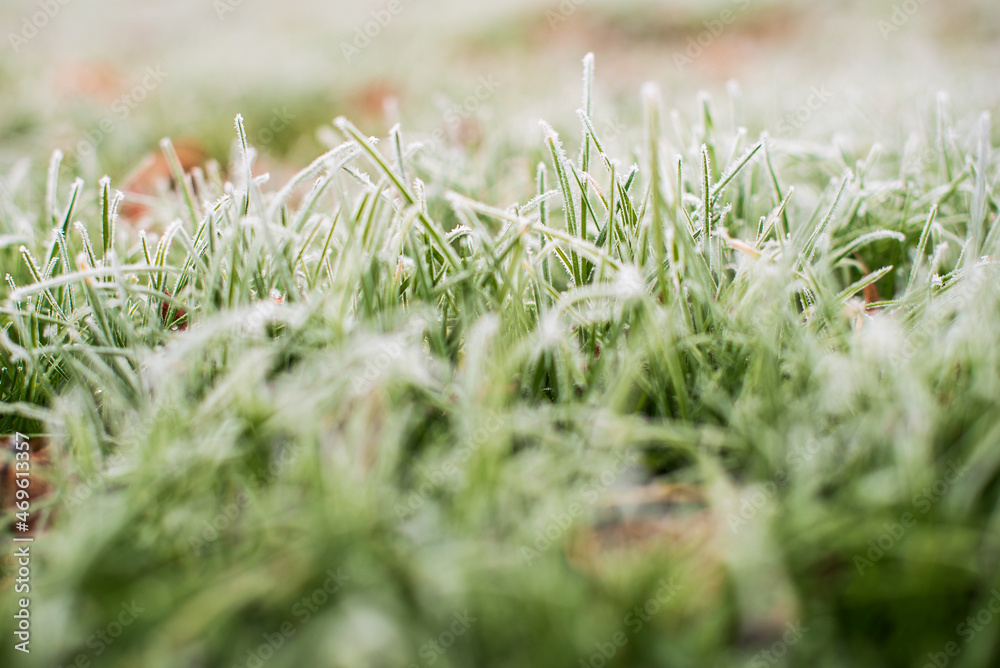 Frosty green fresh grass and brown dead leaves on a cold autumn morning