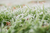 Frosty green fresh grass and brown dead leaves on a cold autumn morning