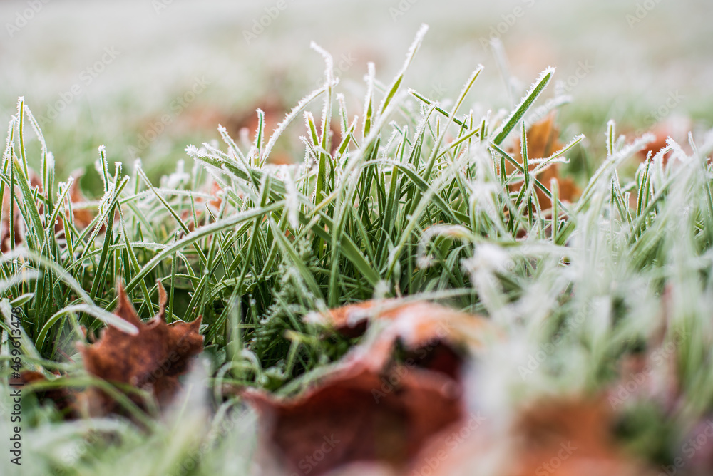 Frosty green fresh grass and brown dead leaves on a cold autumn morning
