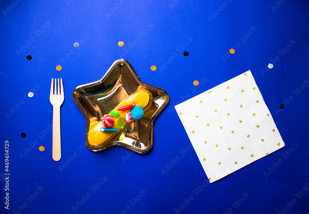Halloween dessert. Yummy eclair on gold star shaped plate, disposable fork, napkin with hearts on blue background. Oct. 31 festive Decor. Stylish party ware. Jack o lantern pumpkin shaped confetti.