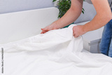 A man puts an elasticated sheet on the mattress. Change of bed linen.