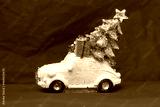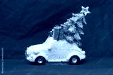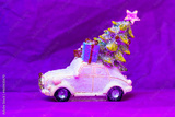 Toy car. Christmas tree, gift box on purple backdrop. New Year 2022 winter sales