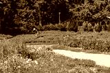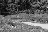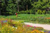 A path between colorful multicolored blooming flowers in a flowerbed in a botanical garden, park at sunny autumn day, fall season, in the end of summer. Blossoming, floral background. A gardener works